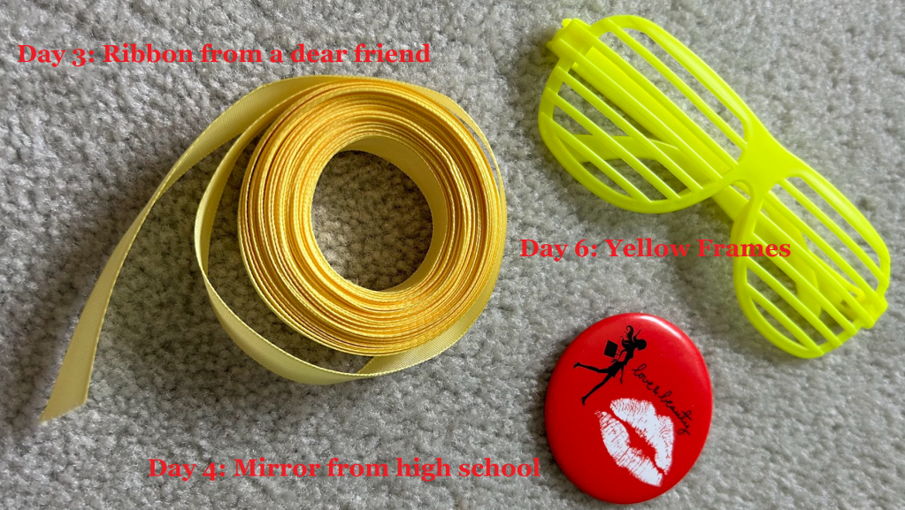 I got a ribbon from a friend to use during my Disneyland trip with some friends who I regard as sisters. The mirror was something my mom bought me during high school from Forever 21. The yellow frames were from last summer in 2022 that I wore with my coworkers. Fond memories, but definitely it’s ok to let them go.